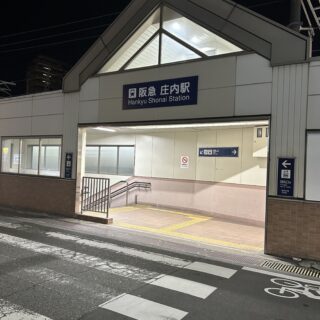 阪急宝塚線 庄内駅改札西口(右側)を出てすぐ歩道に渡り左に曲がります。(梅田方面)